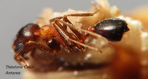 Elle fait 2.5mm, thorax rouge, tête brun clair, abdomen noir. Elle a des mandibules assez fines et longues avec assez peu de dents au bout. Les antennes ont une massue antennaire de 3 articles. Il y a de nombreux poils répartis de manière régulière sur la tête. Le thorax est ponctué finement comme le postpétiol et le pétiol. Le gastre a de longs poils érigés vers la fin du premier tergite. On voit peu de tergite, le premier semble être le plus long.