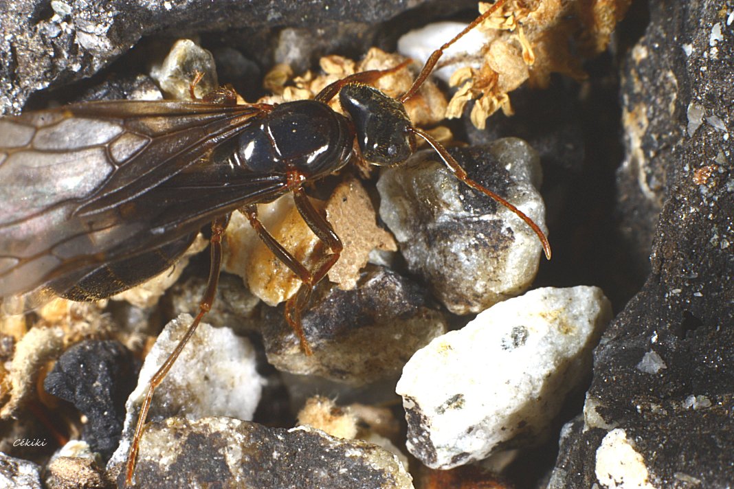 l'ouvrière : la princesse : Nid observé en bordure de route, entre le goudron et une souche. Le signal du vol a été donné en même temps que Pheidole pallidula observé au même moment à 17h00. Ciel menaçant se couvrant après une chaleur pesante. Sans pluie.