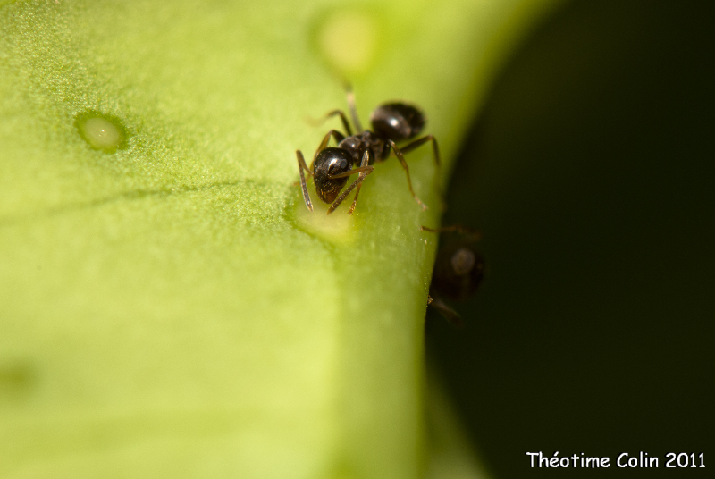 Sous une feuille de laurier-cerise(?) (Prunus laurocerasus?), Lasius neglectus sur nectaires extrafloraux, Rhône-Alpes, Juillet 2011.