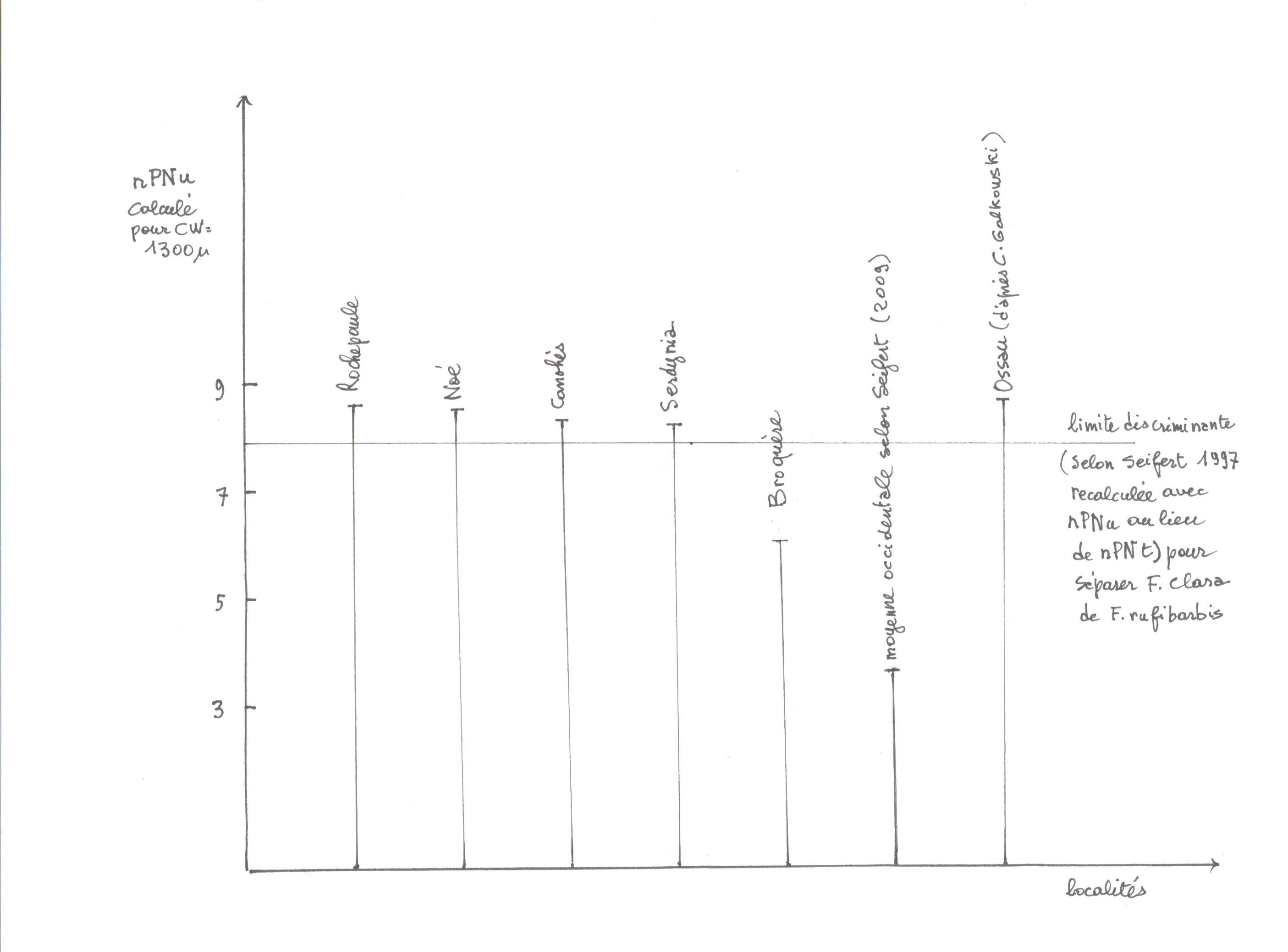 Pour tout l'échantillon et en applicant le critère discriminant de Seifert, 42 individus seraient rufibarbis, 27 clara et 7 "à la limite".