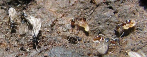 Le jour où j'ai vu les accouplements correspond au lendemain d'une période pluvieuse. Je ne sais pas si ça a un rapport mais ça pourrait valoir le coup de noter ce genre d'information. Si jamais ça avait un quelconque rapport ça permettrait de cibler au mieux les périodes les plus intéressantes pour les trouver, voir de provoquer ces périodes en arrosant un peu les nids de Tetramorium . C'est une technique qui est utilisée pour détecter une espèce inquiline de Pogonomyrmex aux Etats-Unis, mais les conditions sont très différentes, ce sont des espèces désertiques, l'eau a probablement beaucoup plus d'importance (même si cette inquiline ne creuse pas elle-même de trou).