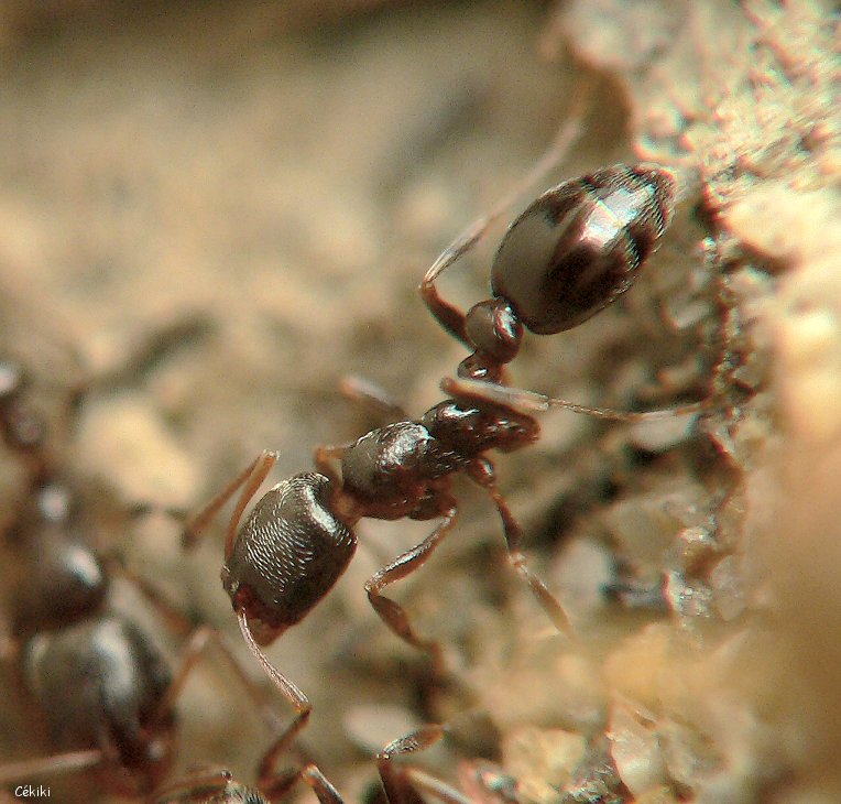 large postpétiole : tête ponctuée : autre particularité : je n'arrivais pas à les prendre en photo car elles bougent tout le temps. Pour tenter de les fixer : leur donner à manger. Liquides sucrés refusés. Bout de jambon toléré furtivement, miette de thon à peine effleurée. Elles sont dites omnivores.
