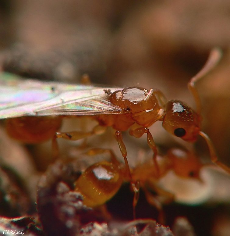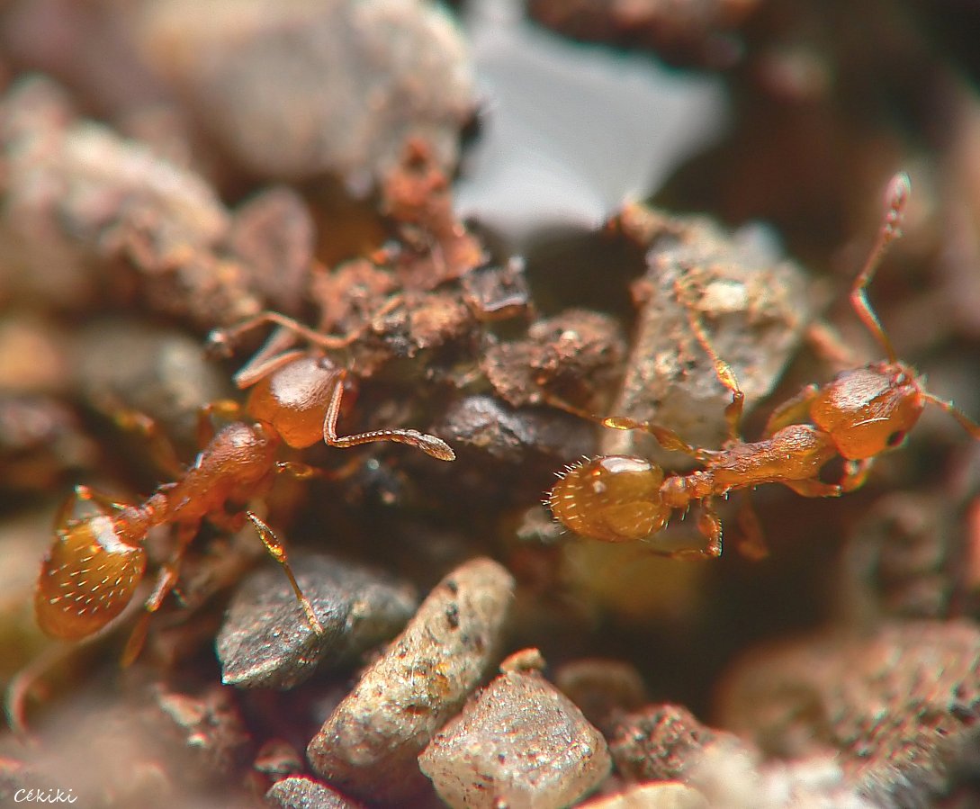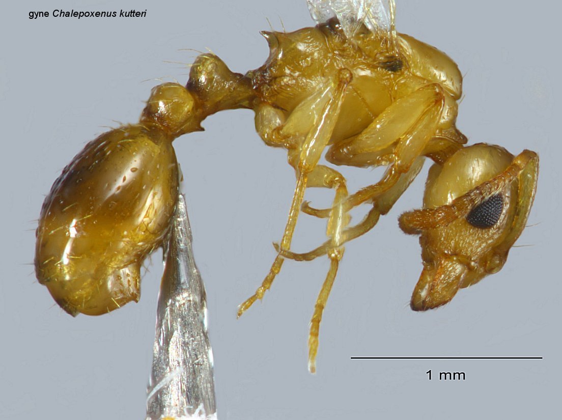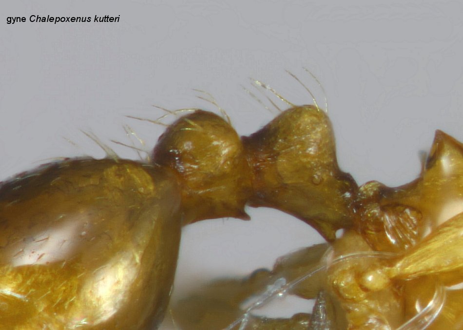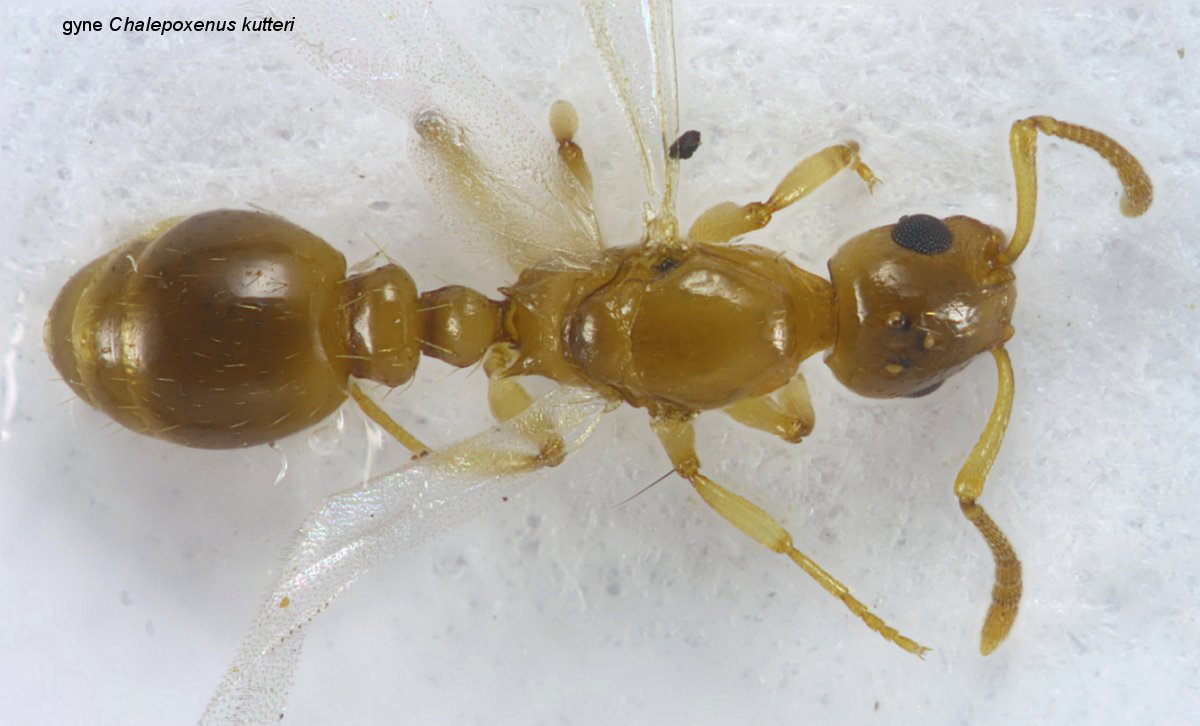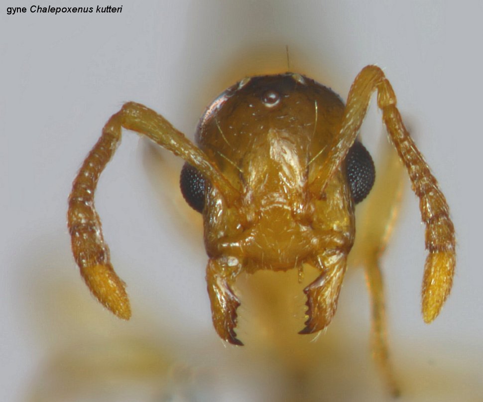 Les Chalepoxenus muellerianus sont assez faciles à distinguer de leurs hotes à l'oeil sur le terrain. Mais quand je vois la photo de l'ouvrière de C. kutteri avec l'ouvrière de T. racovitzai, je me dit que ça doit être une autre paire de manches... Mais les ouvrières de C. kutteri ont peut-être une attitude un peu différente, ce qui pourrait aider à les détecter (d'où ma question). Par exemple, les ouvrières de Myrmoxenus kraussei sont assez difficiles à détecter dans un nid de T. recedens, mais avec un peu d'habitude on remarque qu'elles ont une "démarche" un peu moins "dégourdie" et des proportions un peu différentes (et une coloration globalement plus claire, bien que la coloration ne soit pas toujours un bon critère). OK, c'est pas très scientifique tout ça, mais ça marche.
