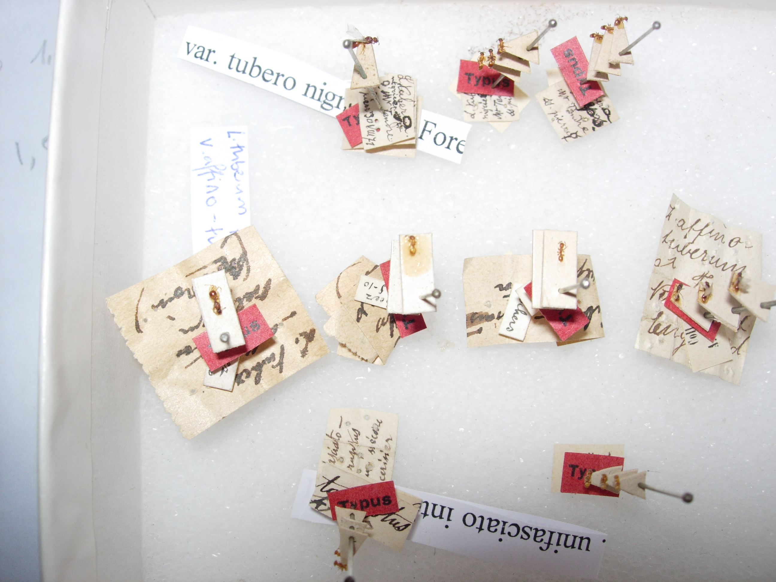 Il y a des choses pas nettes dans la collection Forel : dans le cas de Temnothorax luteus, la description originale donne les localités « Grand Salève et Tessin ». Ce sont deux localités différentes : Grand Salève est au sud de Genève et le Tessin un canton italien de Suisse. Le « type » de luteus présenté dans la collection Forel provient de Dieulefit (néotype désigné par Schulz et Verhaagh). Mais la fixation de ce néotype n’a jamais été publiée et l’article 75.3.6 du CINZ n’a pas été respecté : donc ce type doit être rejeté. Un néotype de luteus reste à fixer à partir de spécimens récoltés du Grand Salève ou du Tessin (qui existent par ailleurs, voir Giacalone et Moretti (2001) : Contributo alla conoscenza della mirmecofauna dei castagneti al sud delle Alpi (Ticino, Svizzera), Bollettino della Societa di Scienze naturali p51-60).